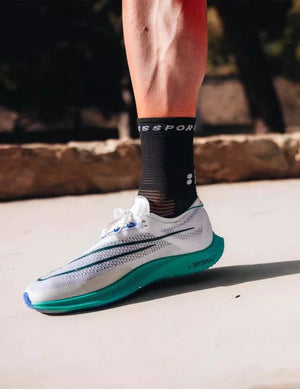 Laufsocken mit halsnahem Schnitt, eingearbeiteten kühlenden Fasern und einem rutschfesten Band, um Überhitzung und Blasenbildung bei langen Straßenläufen zu vermeiden.